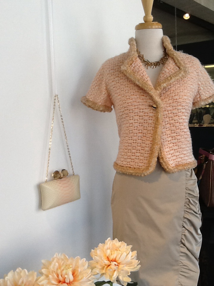 Jul17 Four different consignors created one great look! Posted on July 17, 2014 by Lori Standard It was meant to be. Bottega Veneta cardigan paired with Yigal Azrouel skirt and Judith Leiber chained clutch. ( Don’t forget your Chanel necklace!)